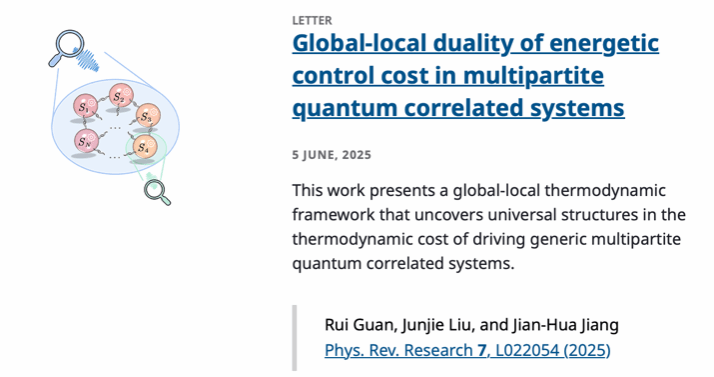 近日,钱伟长学院2022级应用物理学专业本科生管睿在导师刘俊杰教授和中国科学技术大学蒋建华教授的共同指导下,在量子多体关联体系的量子调控能量成本方面取得研究进展,以第一作者在美国物理学会期刊《Physical Review Research》上以Letter的形式发表了题为 “Global-local duality of energetic control cost in multipartite quantum correlated systems”的研究论文,并被期刊主页宣传。